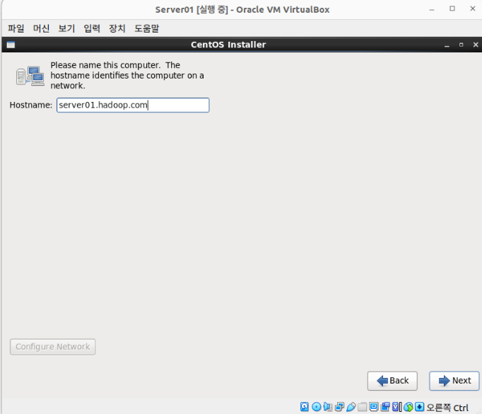 6. HOSTNAME을 Server01.hadoop.com으로 지정하고 설치 진행