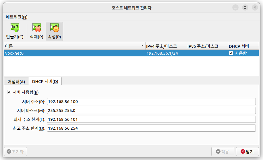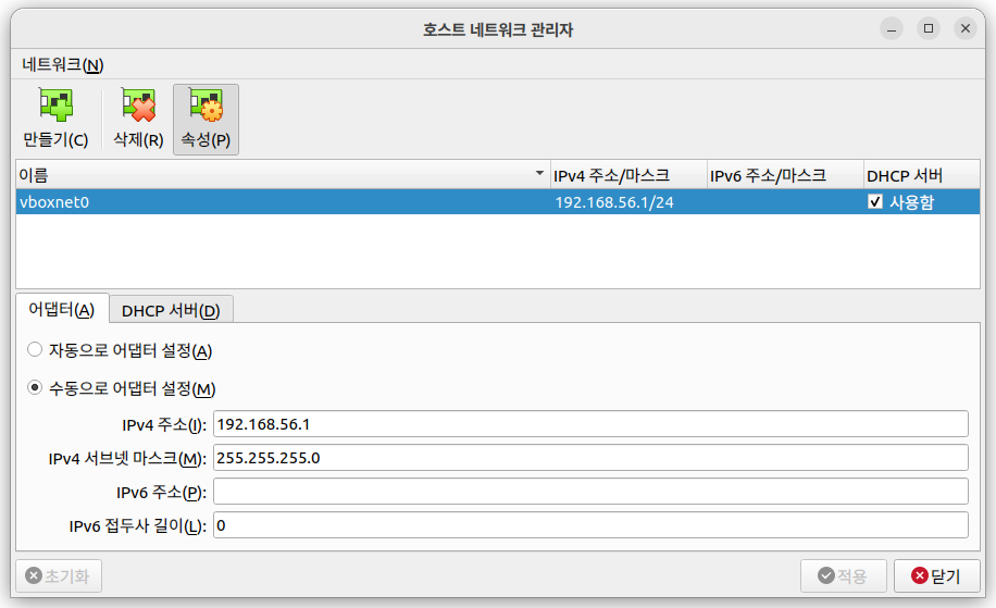 1. [파일] - [호스트 네트워크 관리자]로 들어가 어댑터 / DHCP 서버를 만들어준다