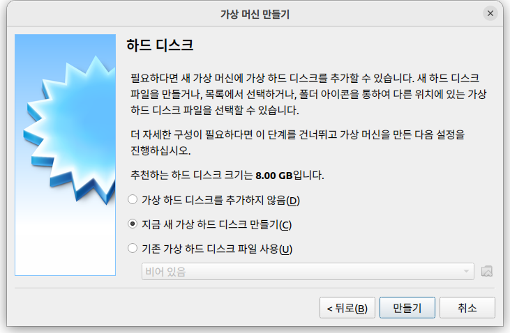 3. VDI, 동적 할당, 30GB로 하드디스크의 크기를 설정(SSD 권장)