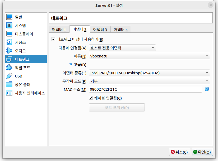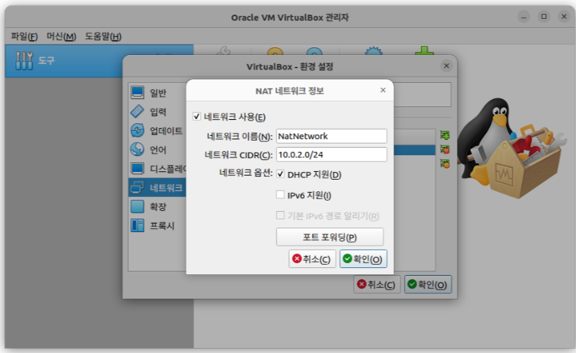 1. [파일] - [환경 설정] - [네트워크] 에서 위 사진과 같이 NatNetwork를 만들어 준다.