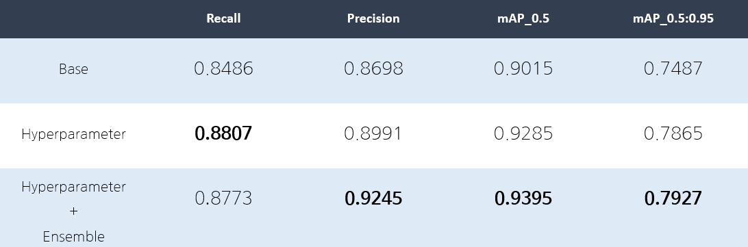 mAP_0.5 : 0.95의 정확도를 올리기 위해 하이퍼파라미터를 최적화를 진행하였고 다른 모델과의 앙상블을 통해 0.7927이라는 정확도까지 올렸지만 0.85까지가 목표였지만 달성하지 못하였다.