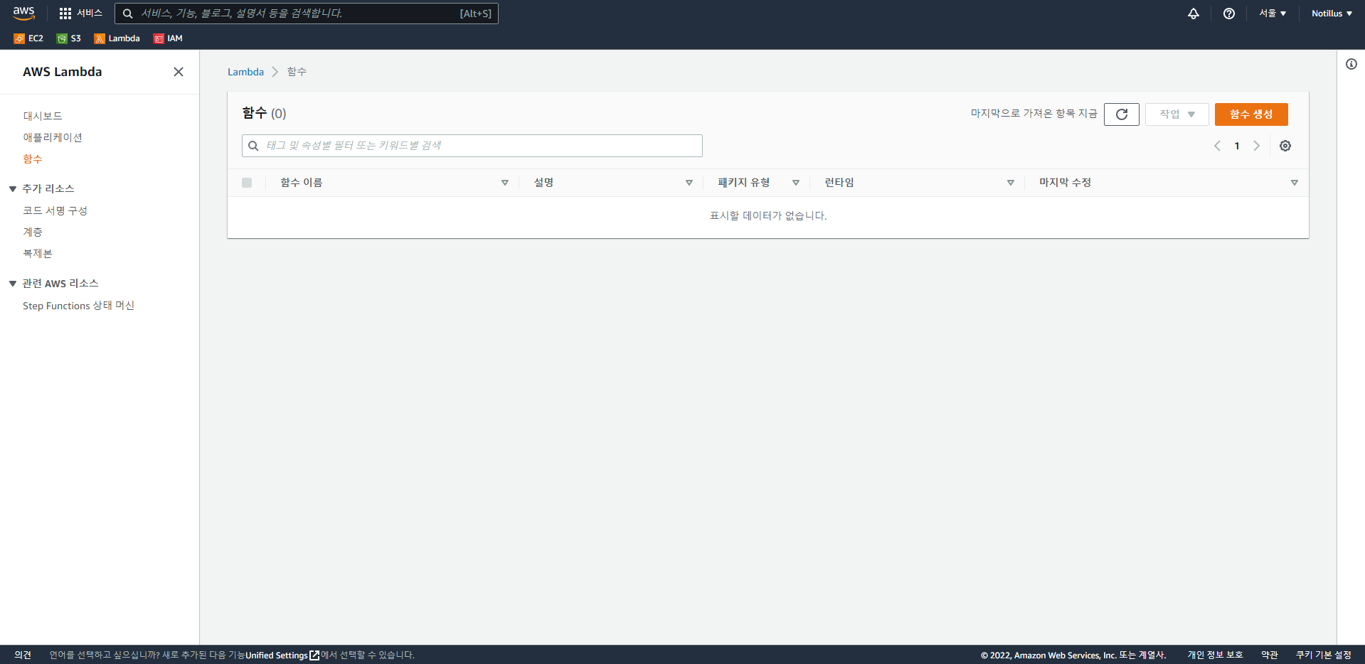 Lambda 서비스로 넘어가서 함수 생성을 클릭해서 함수 생성을 진행 할 것이다.