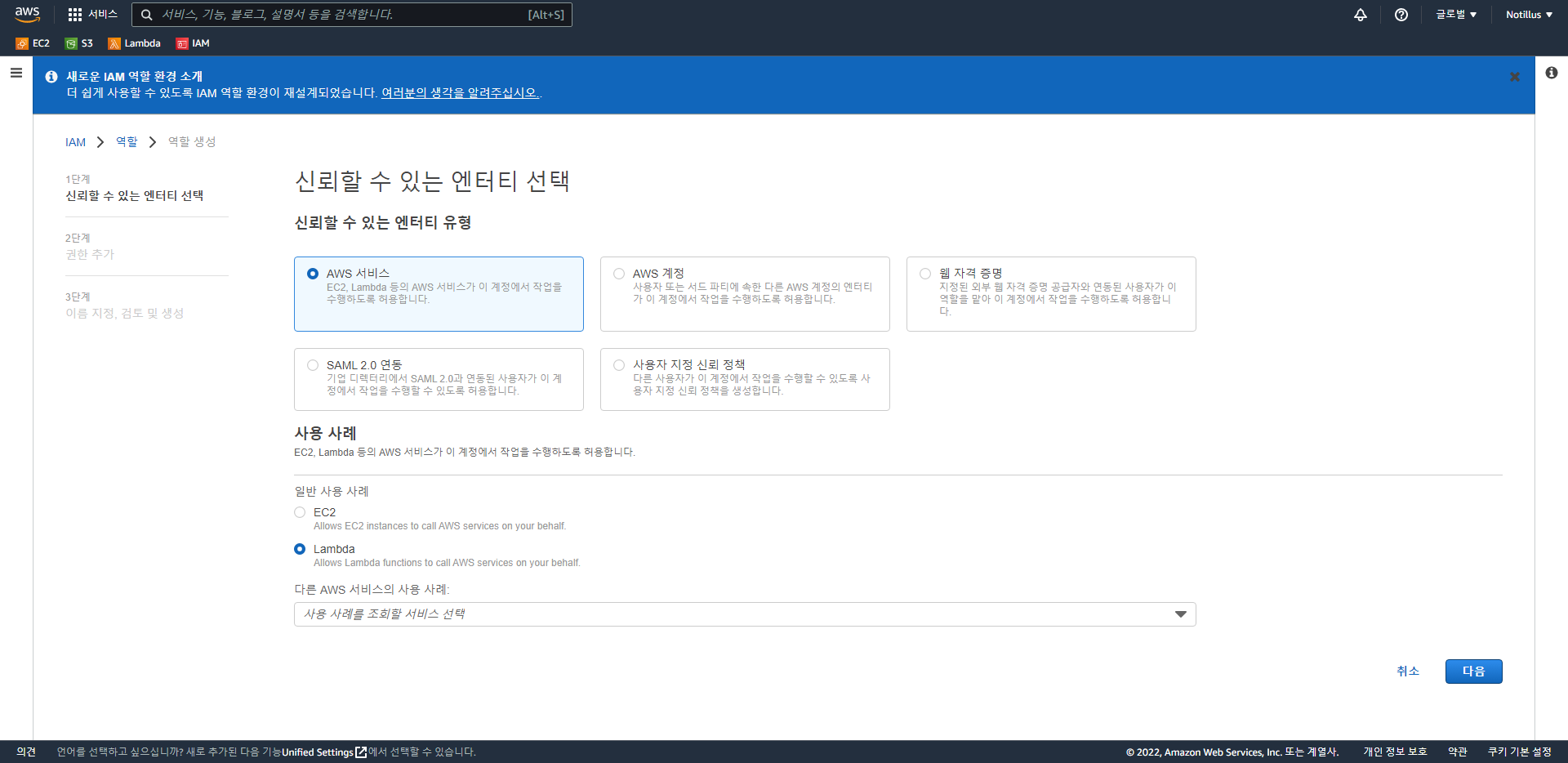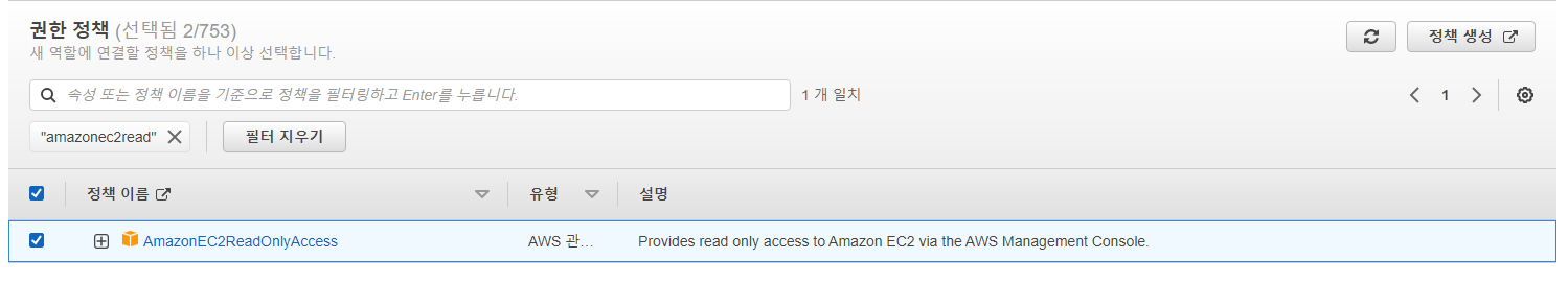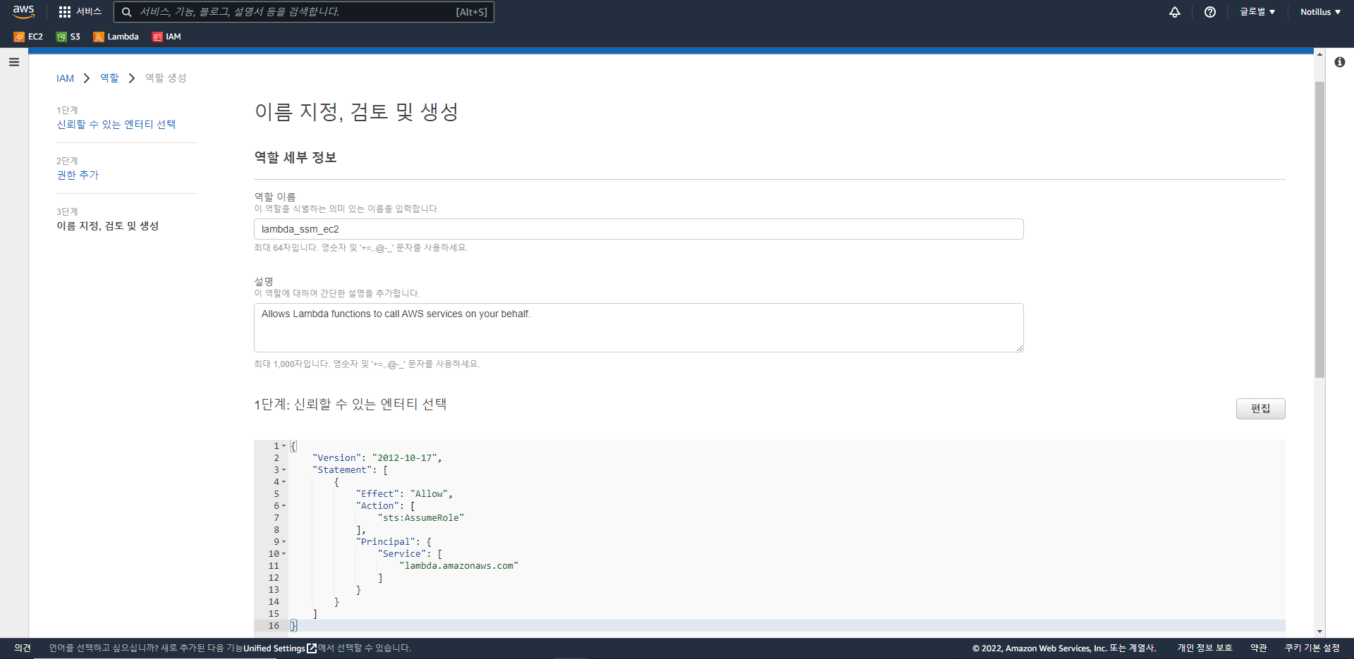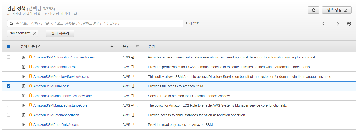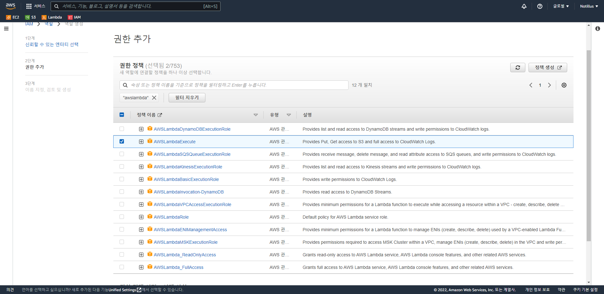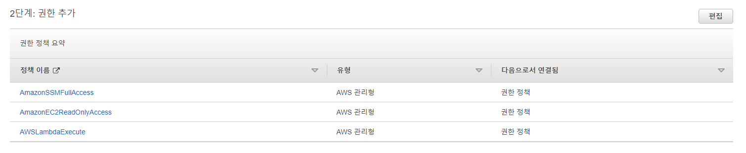 "AWSLambdaExecute", "AmazonEC2ReadOnlyAccess", "AmazonSSMFullAccess" 이렇게 3개를 선택해주면 되며