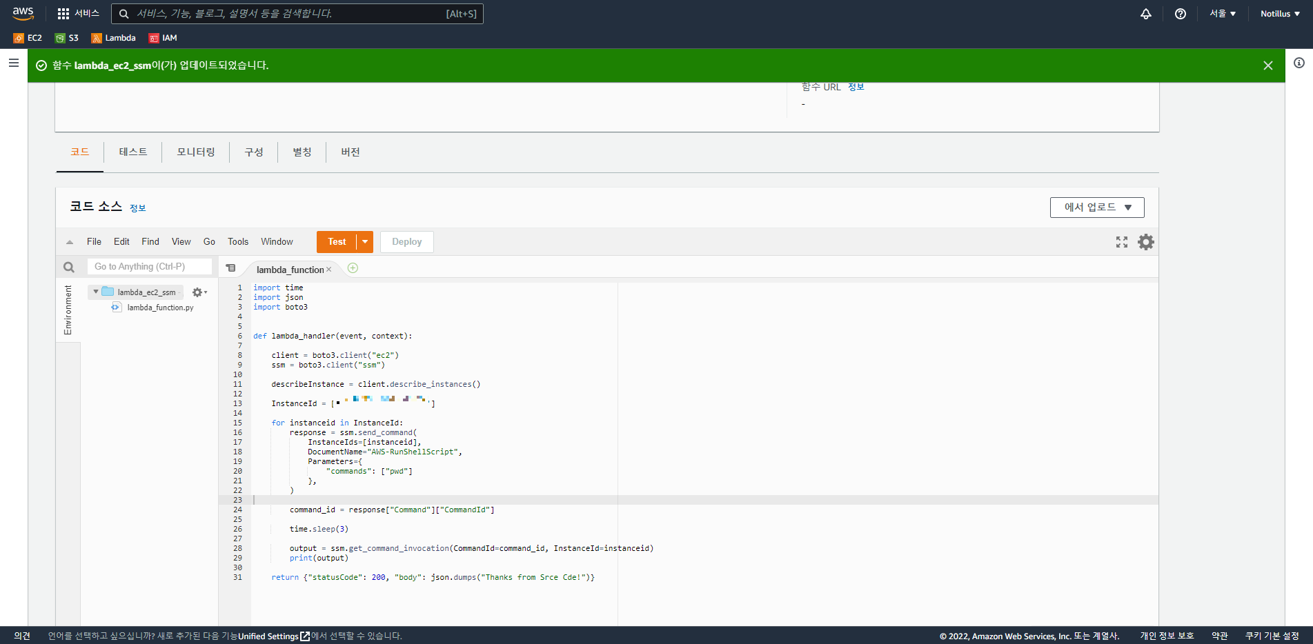 위에서 보는 코드는 EC2 인스턴스에 접근해서 AWS System Manager를 통해 EC2에 Command를 날려주는 역할을 하는 코드이다