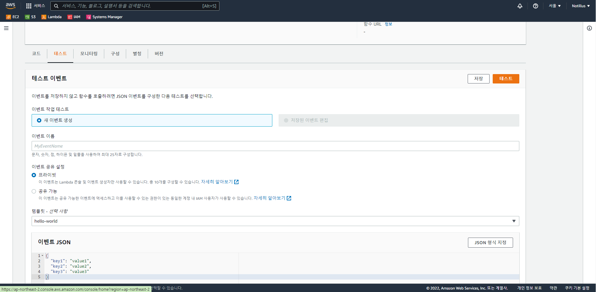 테스트를 진행하기 전에 확인해야 할 부분이 한가지 있는데, 람다 함수를 생성하면 default 값으로 실행시간이 3초가 지나가면 실패하도록 설정이 되어있는데 이 부분을 변경해 주어야한다.