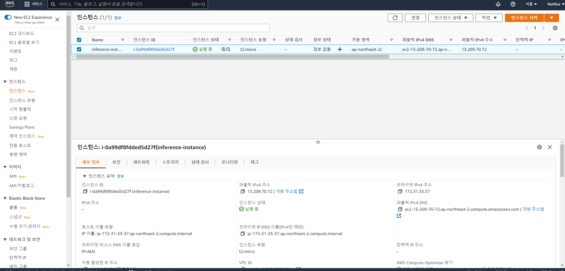 AWS Service 검색창에서 EC2로 검색하면 위 사진과 같은 화면이 뜬다 우측 상단에 보이는 "인스턴스 시작" 버튼을 누른다. 생성하려는 인스턴스 이름을 적어주고 원하는 운영체제를 선택해서 지정해준다. 필자는 Ubuntu 22.04 LTS로 해주었다(Window는 Linux보다 가격이 조금 더 나간다) 인스턴스 유형으로 추론 인스턴스는 inf1.xlarge를 사용하였지만, 여기서는 프리티어로 지정하여 생성하였다. 처음 써본다면 프리티어를 먼저 사용해서 익숙해지고 난 이후에 높은 인스턴스를 사용하기를 추천한다. 키 페어는 로컬에서 해당 인스턴스로 접근하기 위해서 필수적으로 필요한 key를 발급해준다. Window에서는 .ppk형태로 putty로 이용해서 접속하고, linux와 mac은 .pem형태로 ..