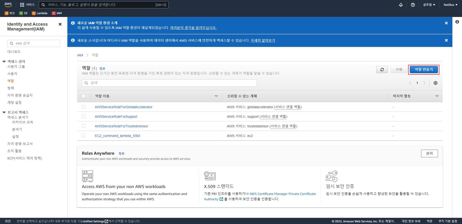 이번 포스트는 이전에 생성해둔 EC2에 정책을 부여하는 포스트이다. AWS에서 정책은 권한이라는 개념으로 생각하면 되며 만일 Lambda나 SSM를 통해 EC2로 접근하고 싶은데 정책이 설정되어 있지 않다면 접근이 불가능하기 때문에 꼭 필요한 작업이다. 1. IAM 역할 생성 IAM에서 왼쪽 메뉴의 "엑세스 관리"에서 역할을 클릭한다. AWS 서비스와 밑의 사용 사례에서 EC2를 체크하고 다음을 클릭 해당 역할은 EC2에 적용할 역할이기 때문에 EC2로 설정하였지만 다른 서비스로 적용할 것이라면 다른 서비스를 선택하여 주면 된다. 권한 정책에서 "amazonssm"으로 검색을 하면 검색어 관련 정책들 중 "AmazonSSMMageInstanceCore"를 선택하고 다음을 누른다. 역할 이름을 지정해주고 ..